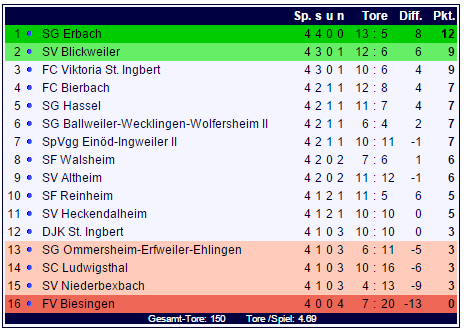 In der Tabelle der Bezirksliga Homburg steht die SG Erbach verlustpunktfrei ganz oben, der FV Biesingen ist das krasse Gegenstück und belegt ohne Punkt den letzten Tabellenplatz:
