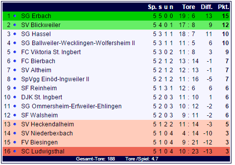 In der Tabelle der Bezirksliga Homburg bleibt die SG Erbach mit vollends weißer Weste ganz oben in der Tabelle, Ludwigsthal, Niederbexbach und Biesingen stehen mit jeweils drei Punkten am Ende der Tabelle: