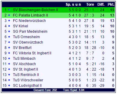 Am Ende gewinnt der FC Palatia Limbach II auf eigenem Platz mit 11:0 gegen den SV Alschbach und steht mit 13 Punkten ungeschlagen auf Rang zwei der Tabelle, Alschbach steht mit drei Punkten auf Tabellenplatz 12.