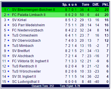 In der Tabelle der Kreisliga A Bliestal bleibt der SV Bliesmengen-Bolchen II zwar Spitze, vor allem die Palatia-Reserve aus Limbach rückt dem SVB aber bis auf einen Punkt auf die Pelle: