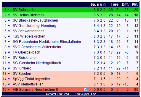 In der Tabelle der Landesliga Ost bleibt der SV Rohrbach das Maß aller Dinge, dahinter folgen drei Aufsteiger: Der SV Hellas Bildstock, der SC Blieskastel-Lautzkirchen und der SV Genclerbirligi Homburg.