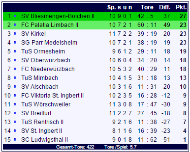 In der kommenden Woche geht es weiter: Unter anderem empfängt dann der FC Niederwürzbach den SV Bliesmengen-Bolchen II, schon am Samstag reist der TuS Mimbach zum FC Palatia Limbach II: