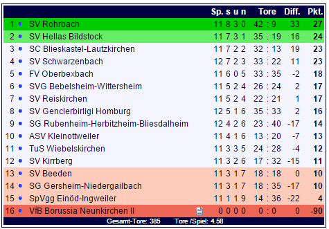 Komplettiert wurde der 12te Spieltag durch das Gastspiel des SV Beeden beim Spitzenreiter des SV Rohrbach. Der heimische SVR hatte seine Spitzenposition in der Vorwoche durch einen 2:0-Auswärtserfolg bei der SVG Bebelsheim-Wittersheim ausgebaut, während sich der SV Beeden nach einer 1:3-Heimpleite gegen den SV Hellas Bildstock in höchster Abstiegsnot befand. Nun wollte der SVB gegen den Spitzenreiter bestehen.
