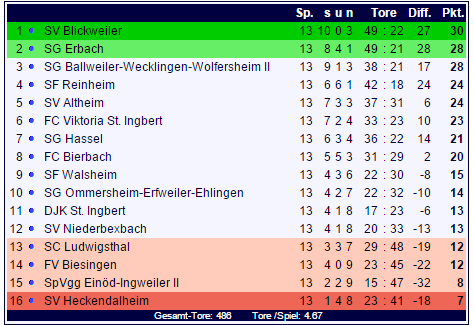 Damit ist der 13te Spieltag der Bezirksliga Homburg gespielt: Die SG Erbach und der SV Blickweiler feiern deutliche Siege, die SG Ballweiler-Wecklingen-Wolfersheim II muss sich auf eigenem Platz geschlagen geben: