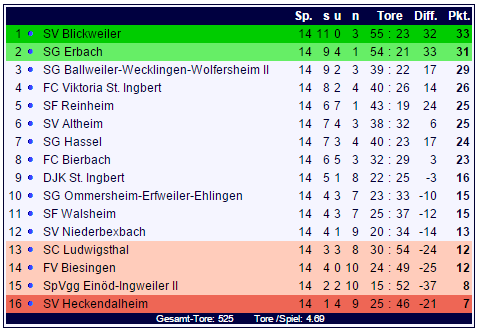 Komplettiert wurde der 14te Spieltag durch ein Gastspiel der SG Ballweiler-Wecklingen-Wolfersheim II beim SV Altheim. Die SG-Reserve verlor in der Vorwoche nach einer 2:4-Heimschlappe gegen den Fc Viktoria St. Ingbert II die Tabellenführung während der SV Altheim mit einem 2:1-Auswärtserfolg die Heimserie des FC Bierbach beendete. Nun wollten beide Teams im Derby bestehen.