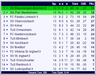 Komplettiert wurde der 14te Spieltag durch ein St. Ingberter Derby: Der TuS Rentrisch II reiste nach einer 0:5-Heimschlappe gegen die SG Parr Medelsheim zum SV Oberwürzbach, der mit einem 9:2-Auswärtserfolg beim Tabellenschlusslicht des SC Ludwigsthal II Selbstvertrauen tankte.
