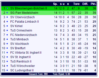 In der Tabelle der Kreisliga A Bliestal geht der SV Bliesmengen-Bolchen II als Herbstmeister durchs Ziel, bis auf Platz sieben geht die Reihe der Verfolger und die Rückrunde verspricht ein heißes Rennen um Relegation und Aufstieg: