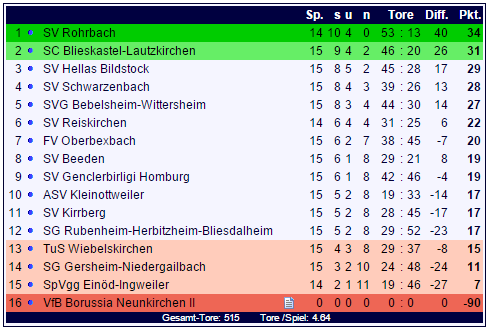 Damit ist der 16te Spieltag der Saison gespielt. Während der SV Rohrbach witterungsbedingt pausieren musste, konnten die Verfolger allesamt punkten, der SV Hellas Bildstock sogar dreifach: