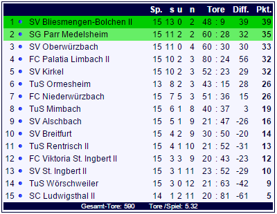 Komplettiert wurde der 16te Spieltag durch das Gastspiel des Spitzenreiters aus Bliesmengen-Bolchen beim SV Breitfurt. die Verbandsliga-Reserve feierte am 15ten Spieltag einen 2:1-Heimerfolg im Spitzenspiel gegen den FC Palatia Limbach II, Breitfurt unterlag auf eigenem Platz dem SV Kirkel mit 1:4.