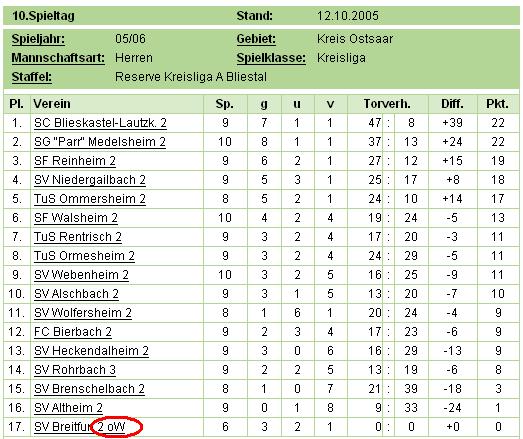 Normalerweise sollte man davon ausgehen, dass die beim DFB bzw. SFV veröffentlichten Tabellen relevant sind und nicht die aus der Presse (SaarAmateur), aber wiedereinmal musste man feststellen wie diletantisch sich der größte Fußballverband der Welt und speziell sein Regionalverband der SFV offensichtlich verhält:Schön, dass man nun im Saaramteur veröffentlicht Breitfurt 2 spiele in der Wertung, aber es sollte doch irgendjemanden beim SFV geben, der in der Lage ist, dann auch die Tabelle beim DFBnet zu ändern, denn nochmal der Hinweis: Die Tabellen dort sind verbindlich, sonst hätte man sich auf Seiten des DFB das Geld für den groß angelegten Ergebnismeldedienst sparen können. Davon mal abgesehen wusste ich nicht, dass der SaarAmateur das offiezielle Mitteilungsblatt des DFB ist.