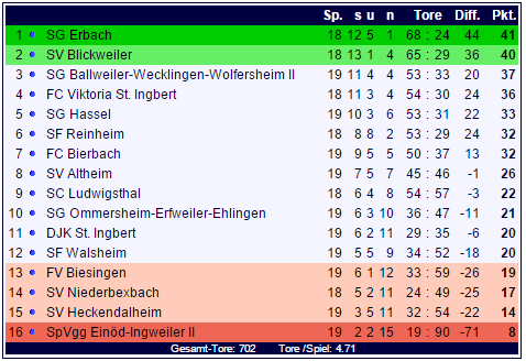 Damit ist der 19te Spieltag der Bezirksliga Homburg gespielt, drei Spiele warden in zwei Wochen nachgeholt. Der FV Biesingen sorgt für die Überraschung des Spieltages, konnte er doch auf eigenem Platz gegen die SG Ballweiler-Wecklingen-Wolfersheim II gewinnen:
