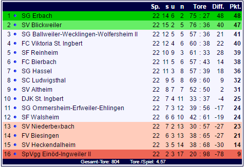 In der Tabelle der Bezirksliga Homburg gibt es damit erneut einen Führungswechsel: Die SG Erbach liegt nun einen Punkt vor dem SV Blickweiler auf dem Platz an der Sonne, am Tabellenende sind die SpVgg Einöd-Ingweiler II und der SV Heckendalheim isoliert.