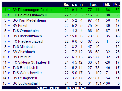 In der Tabelle der Kreisliga A Bliestal setzen sich die Verbandsliga-Reserven aus Bliesmengen-Bolchen und Limbach an der Tabellenspitze immer mehr ab. Die Verfolger auf den Rängen drei bis sechs rücken immer näher zusammen: