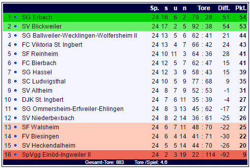 In der Tabelle der Bezirksliga Homburg bleibt die SG Erbach mit einem Punkt vor dem SV Blickweiler, der Abstand zur SG Ballweiler-Wecklingen-Wolfersheim II auf Rang drei scheint mit neun Zählern so groß, dass man einen Zweikampf um den Titel erwarten kann. Der SV Heckendalheim stellt den Anschluss zu den Nichtabstiegsplätzen her.