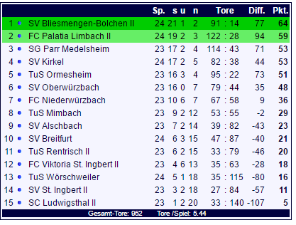In der Tabelle der Kreisliga A Bliestal ändert sich naturgemäß wenig: Die Spitzenteams ziehen ihre Kreise, der SV Bliesmengen-Bolchen II bleibt fünf Zähler vor dem FC Palatia Limbach II an der Spitze, dahinter folgte ein breites Verfolgerfeld: