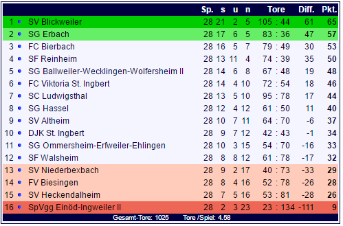 Die SG Erbach liegt weiter vier Punkte vor dem Aufsteiger des FC Bierbach auf Rang zwei der Tabelle und könnte den Relegationsplatz am kommenden Wochenende sicher. Am Tabellenende müssen Heckendalheim, Biesingen und Niederbexbach am Meisten zittern: