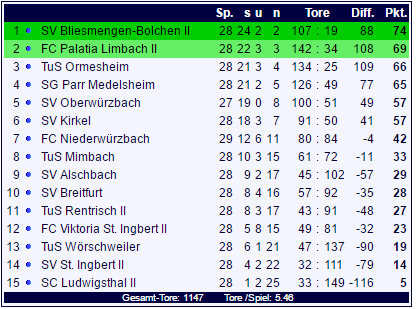 In der Tabelle der Kreisliga A Bliestal gibt es entsprechend keine Verschiebungen: Der SV Bliesemngen-Bolchen II schließt die Saison mit 74 Punkten auf Rang eins ab, dahinter zieht der FC Palatia Limbach II mit 69 Punkten in die relegationsrunde ein, der TuS Ormesheim verpasst selbige auf Rang drei um drei Zähler: