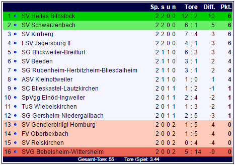 Der SV Hellas Bildstock übernimmt durch den Kantersieg die Tabellenspitze und steht dort mit drei weiteren teams, die ohne Punktverlust in die Saison starteten. Die Teams der zweiten tabellenhälfte sind dagegen allesamt ohne sieg in die Saison gestartet:
