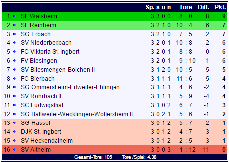 In der Tabelle der Bezirksliga Homburg sind die verlustpunktfreien Sportfreunde aus Walsheim das Maß aller Dinge, Altheim dagegen steht punktlos am Tabellenende: