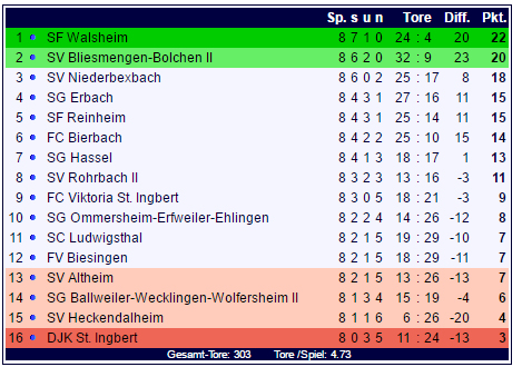 In der Tabelle der Bezirksliga Homburg bleiben die ungeschlagenenen Sportfreunde aus Walsheim mit 22 Puntken zwei Zähler vor dem Aufsteiger des SV Bliesmengen-Bolchen II an der Tabellenspitze, die DJK St. Ingbert ist nun neues Schlusslicht: