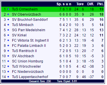 Durch den deutlichen Heimsieg sichert sich der TuS Ormesheim die Tabellenspitze der Kreisliga A Bliestal einen Punkt vor dem SV Oberwürzbach. Der TuS Lappentascherhof ist als einziges Team bis dahin ohne Punkt: