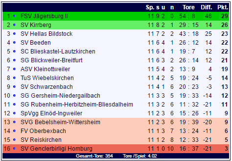 In der Tabelle der Landesliga Ost liegt der FSV Jägersburg II nun mit 29 Punkten alleine an der Tabellenspitze und bringt drei Punkte zwischen sich und den SV Kirrberg. Auch die anderen Verfolger mussten zuletzt abreißen lassen: