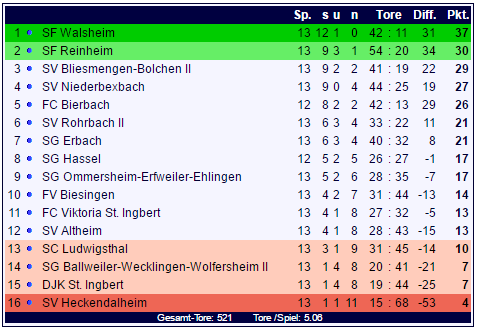 In der Tabelle der Bezirksliga Homburg bleiben die SF Walsheim sieben Punkten vor den SF Reinheim Tabellenführer und sind damit Herbstmeister der Bezirksliga Homburg. Herzlichen Glückwunsch! Der SC Ludwigsthal ist vorbehaltlich der angekündigten Punktabzüge Schlusslicht der Tabelle und muss zusammen mit der DJK St. Ingbert, der SG Ballweiler-Wecklingen-Wolfersheim II und dem SV Heckendalheim mehr denn je um den Klassenverbleib zittern.
