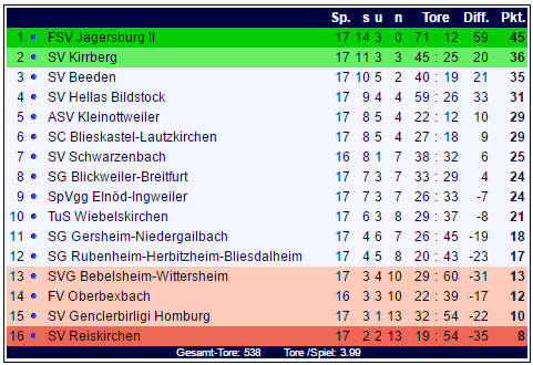 In der Tabelle der Landesliga Ost überwintert der ungeschlagene Spitzenreiter des FSV Jägersburg II mit 45 Punkten stolze neun Punkte vor dem Tabellenzweiten aus Kirrberg, dem der SV Beeden im Nacken sitzt. Am Tabellenende überwintert der SV Reiskirchen.
