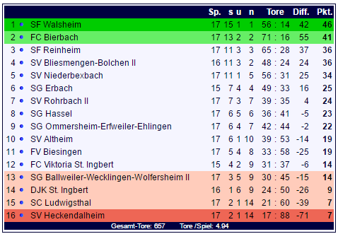 In der Tabelle der Bezirksliga Homburg stehen die Sf Walsheim mit 46 Punkten weiter souverän an der Tabellenspitze, verfolgt vom FC Bierbach, der fünf Punkte dahinter auf Rang zwei folgt. Am Tabellenende zittern Heckendalheim und Ludwigsthal um den Klassenverbleib: