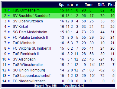 In der Tabelle der Kreisliga A Bliestal ändert sich wenig: Ormesheim bleibt dank des späten Treffers drei Punkte vor dem SV Bruchhof-Sanddorf an der Spitze der Tabelle, die SG Parr Medelsheim verliert den Relegationsrang aus den Augen:
