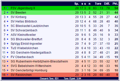 In der Tabelle der Landesliga Ost gibt es nur wenige Veränderungen: Der SC Blieskastel-Lautzkirchen schiebt sich mit 25 Punkten auf Rang fünf, hat aber neun Zähler Rückstand auf Relegationsrang zwei, der FSV Jägersburg II bleibt ungeschlagen Spitzenreiter der Landesliga Ost und steuert mit zehn Punkten Vorsprung auf Rang zwei scheinbar unaufhaltsam auf den Titel und den Verbandsliga-Aufstieg zu:
