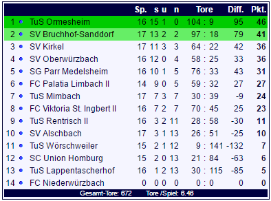 Der TuS Ormesheim darf am Ende doppelt jubeln: Zum einen gab es einen Kantersieg, zum anderen ließ der Tabellenzweite aus Bruchhof-Sanddorf Punkte liegen und steht damit bereits fünf Punkte hinter dem TuS, der zudem ein spiel weniger auf dem Konto hat: