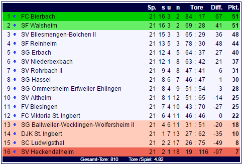 In der Tabelle der Bezirksliga Homburg stehen nun die SF Walsheim und der FC Bierbach punktgleich an der Spitze der Tabelle, der SV Bliesmengen-Bolchen II kommt bis auf drei Punkte an das Spitzenduo heran und ist der Gewinner des Spieltages: