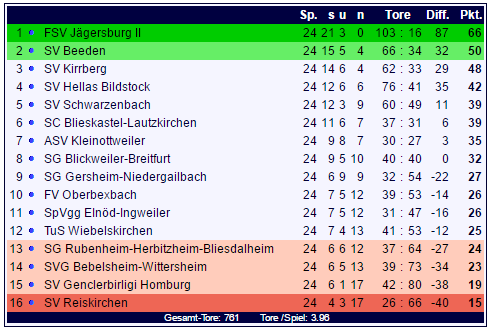 Der FSV Jägersburg II steht damit mit 16 Punkten deutlich vor dem SV Beeden an der Tabellenspitze und könnte bereits am Ostermontag mit einem Sieg als Meister durchs Ziel gehen. Der SV Reiskirchen verliert am Tabellenende dagegen den Anschluss an den Vorletzten des SV Genclerbirligi Homburg.