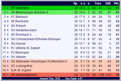 An der Tabellenspitze ändert sich naturgemäß wenig: Walsheim und Bliesmengen-Bolchen bleiben mit 61 Punkten punktgleich an der Tabellenspitze, Bierbach folgt mit 61 Zählern. Am Tabellenende sind der SV Heckendalheim und die DJK St. Ingbert weit abgeschlagen, auch für den SC Ludwigsthal wird das Saisonfinale ein Rechenexempel: