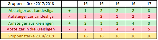 Die Zahl der Absteiger in der Landesliga hängt von drei Faktoren ab: Zum einen von der Zahl der Verbandsliga-Absteiger, zum anderen davon ob der eigene Tabellenzweite den Aufstieg in die jeweilige Verbandsliga realisieren kann und natürlich davon wie viele Vereine aus den Bezirksligen in die jeweilige Landesliga aufsteigen. Auch ist in den jeweiligen Zahlenspiegeln zu erkennen, wann die anderen drei Landesligen aufgestockt würden: