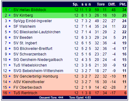 Weiter ging es dann am Sonntag mit den verbleibenden sieben Spielen des 12ten Spieltages und so gab es auch das Verfolgerduell in Kirrberg zu sehen:
