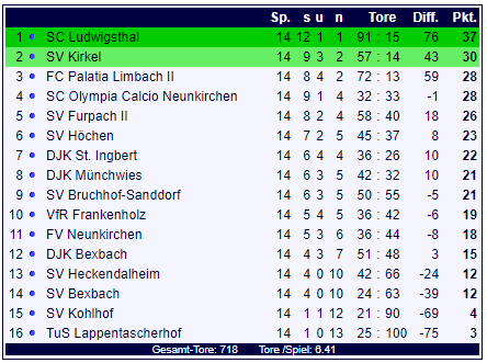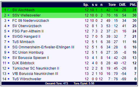 Durch die 1:4-Niederlage des SSV Wellesweiler in Oberwürzbach springt der SV Alschbach durch den Sieg im Spitzenspiel und Derby mit 31 Punkten an die Tabellenspitze. Wellesweiler und Niederwürzbach folgen mit 30 Punkten in Schlagdistanz.