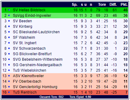 Vor 100 Fußballfans in Blickweiler boten die Hausherren der SG Blickweiler-Breitfurt den Gästen des Spitzenreiters des SV Hellas Bildstock einen heißen Tanz: Manuel Zimmer konnte die Gäste aus Bildstock in der 14. Minute früh in Front bringen, die SG kam aber noch vor der Pause durch Patrick Meyer zum 1:1-Ausgleich. Nach dem Pausentee ließ Sandor Haas die Fans der Heimelf in der 59. Minute jubeln, als er die SG mit 2:1 in Front bringen konnte. Die Gäste aus Bildstock hatten aber wie sooft in dieser Saison das bessere Ende auf ihrer Seite: Onur Dede traf in der 63. Minute zum 2:2-Ausgleich, Manuel Zimmer drehte die Partie in der 75. Minute zu Gunsten des Klassenprimus. Am Ende sorgten Mirco Zavaglia (83.) und Dominic Kuhn (90.) für einen deutlichen 5:2-Auswärtserfolg der Gäste aus Bildstock.