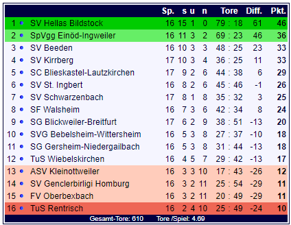 Zum Jahresabschluss ist die Tabelle der Landesliga Ost damit aufgrund zahlreicher Absagen sehr verzerrt, haben doch manche Teams 15 und manche schon 17 Spiele absolviert. Davon unbeirrt ist der SV Hellas Bildstock das Team der Hinrunde und überwintert als Spitzenreiter. Im Verfolgerfeld scheinen die SpVgg Einöd-Ingweiler und der SV Beeden die besten Karten im Kampf um Rang zwei zu haben. Am Tabellenende wird es dagegen eng: Die letzten vier Teams trennen nur zwei Punkte.
