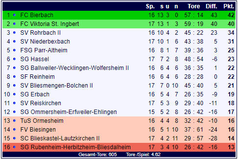 Die Tabelle der Bezirksliga Homburg bietet zum Jahresende ein etwas schiefes Bild, da die Spielabsagen der letzten Wochen zu unterschiedlichen Spielanzahlen führten. Der FC Bierbach führt die Bezirksliga Homburg als Spitzenreiter ins neue Spieljahr, am Tabellenende trennen die Plätze 10 bis 16 nur sechs Zähler, was sicherlich für viel Spannung in der Rückrunde sorgen wird.