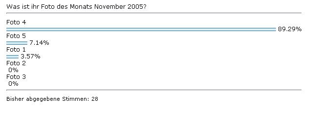 Mit dem Foto des Monats November steht nun auch das letzte Foto fest, das beim "Foto des Jahres" zur Wahl stehen wird. Vom 31. Dezember 2005 bis zum 31. Januar 2006 haben unsere User die Wahl. Aber nun zunächst zur aktuellen Monatswahl: Mit sage und schreibe 89,29 % und damit dem wohl eindeutigsten Ergebnis, seit wir das Foto des Monats wählen setzte sich das Foto von Günter Pusse durch. Hier nocheinmal das Siegerfoto: