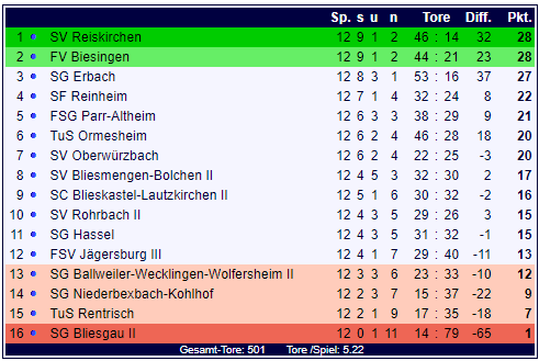 Die Bezirksliga Homburg machte an diesem Wochenende das halbe Dutzend voll: Der 12te Spieltag stand auf dem Terminkalender der Fußballfans und die Fußballfans konnten schon die Halbzeitpause der Saison am Horizont sehen…