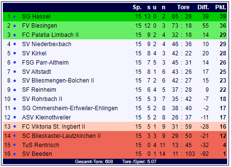 Wer der Meister ist kann man sich denken. 100 pro mit Ballweiler Verbundenheit. Als Kirkel bei uns gespielt war alles im grünen Bereich. Da waren Biesingen und Hassel auffälliger. Ingsgesamt wird die Klasse aber immer schwächer, obwohl viele auf auswärtige Spieler setzen