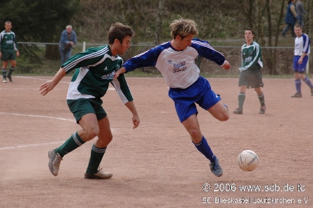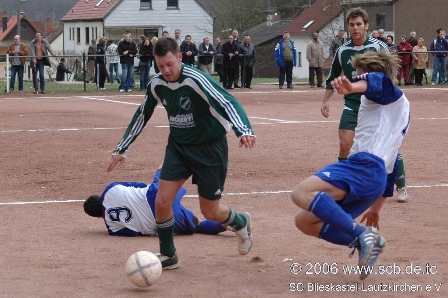 Nach dem Ende der Siegesserie folgte nun der zweite Rückschlag binnen acht Tagen: Der FC Bierbach ist also die zweite Mannschaft die den SC Blieskastel-Lautzkirchen im Jahr 2006 besiegen konnte. Der Spitzenreiter gab sich gegen den SCB am Sonntagnachmittag keine Blöße und sammelte wieder drei wichtige Punkte in Richtung Aufstieg; Blieskastel dagegen hat durch die neuerlichen Niederlagen ein paar Plätze verloren, steht aber immer noch auf einem guten sechsten Tabellenpaltz. Phasenweise spielte der Tabellenführer aus Bierbach auch meisterlich und überzeugte vor allem durch das oft praktizierte und sehr effektive schnelle Umschalten zwischen Defensive und Offensive, das letzlich auch die Grundlage für zumindest zwei der vier Bierbacher Tore war. Blieskastel war aber keineswegs nur ein Sparringspartner für den BFC, sondern hielt über weite Strecken der Partie merh als nur gut dagegen. Bezeichnend: Auch die unglücklihce Entstehungsgeschichte des 1:0 für die Hausherren warf den SCB nicht aus dem Spiel, im Gegenteil man legte nur wenige Minuten später das 1:1 nach und hielt die Partie somit lange Zeit offen und ausgeglichen. Das 1:0 war, das muss man einfach so ausdrücken, nicht mehr als ein Glückstor, das man wohl eher dem extrem schlechten Platz in Bierbach, als dem nominellen Torschützen Thorsten Biet anrechnen sollte. Aber wie schon gesagt, wurde dieser unglückliche Rückstand relativ schnell durch Flavio Baier egalisiert, der nach einer tollen Abwehraktion vom BFC-Schlussmann Martin Buhlen zum 1:1 abstaubt. Zur Pause stand also ein leistungsgerechtes 1:1-Unentschieden, das die Zuschauer auf einen spannenden zweiten Durchgang hoffen ließ. Aber auch nach den Bierbacher Toren zum 2:1 und 3:1 war die Partie keineswegs schon entschieden. Immer wieder brachte der SCB die Hausherren unter Druck und war dem Ausgleich ein ums andere Mal sehr nahe. Leider fiel das lang herbeigesehnte Tor einige Minuten zu spät... (Eigener Spielbericht: >>hier)