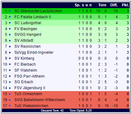 Der Start in die Landesliga Ost hatte einige Tore zu bieten: Der SC Blieskastel-Lautzkirchen kann den TuS Wiebelskirchen auf eigenem Platz mit 10:0 bezwingen, der FV Biesingen gewinnt mit 5:2 bei der SG Erbach und der SC Ludwigsthal schlägt die SVG Bebelsheim-Wittersheim mit 4:0. Alle Spiele und alle Tore auf SCB-Online...