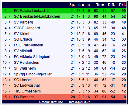 In der Tabelle bleibt der FC Bierbach mit acht Punkten das Schlusslicht der Tabelle. Der SC Blieskastel-Lautzkrichen rangiert mit 52 Punkten drei Zähler hinter dem FC Palatia Limbach II auf Rang zwei, kann aber den Abstand zum Verfulgerduo des SV Kirrberg und der SVGG Hangard auf vier Punkte ausbauen.