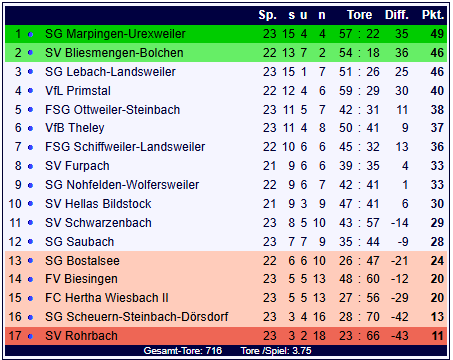 Im Verbandsliga-Spiel zwischen dem SV Furpach und dem Klassenprimus des SV Bliesmengen-Bolchen konnte sich Furpach vor 250 Fußballfans mit 1:0 durchsetzen. Das einzige Tor des Spiels fiel in der 76. Spielminute: Max Wettmann erzielte mit seinem ersten Saisontor das entscheidende 1:0 für Furpach. Zuvor waren beide Teams defensiv stark und ließen kaum nennenswerte Chancen zu. Bliesmengen hatte in der zweiten Halbzeit mit einem Spieler weniger zu kämpfen: In der 87. Spielminute erhielt Nico Valentini die rote Karte und musste das Spielfeld vorzeitig verlassen. Zuvor hatte er bereits eine Zeitstrafe in der 46. Spielminute abgesessen, als er für zehn Minuten vom Platz geschickt worden war. Der SV Bliesmengen-Bolchen muss damit die Tabellenführung an die SG Marpingen-Urexweiler abgeben und steht mit 46 Punkten drei Punkte hinter der Spitze auf Rang zwei der Tabelle. Der SV Furpach rangiert mit 33 Punkten auf Rang acht.