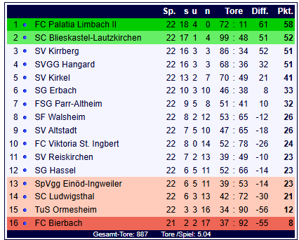 FC Palatia Limbach II: D. Meiche - F. Bach - C. Bühl - R. Dohr - S. Wiedemann - N. Eudenbach - J. Kläs - J. Krause - J. Kroll - D. Hary - T. Müller; Spielerwechsel: Leon-Ian Busch für Jonas Kroll (70.), Benjamin Bubel für David Hary (65.), Jesko Freiler für Nico Eudenbach (70.), Paul Frank für Jonas Kläs (75.), Moritz Ungerbühler für Tom Müller (81.)