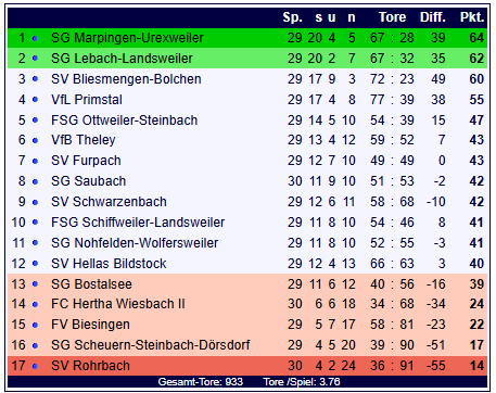 In der Tabelle steht der SV Bliesmengen-Bolchen mit 60 Punkten auf Rang zwei der Tabelle nur einen Punkt hinter dem Spitzenreiter der SG Marpingen-Urexweiler und einen Punkt vor der SG Lebach-Landsweiler, hat allerdings schon ein Spiel mehr auf dem Konto als die Konkurrenz.